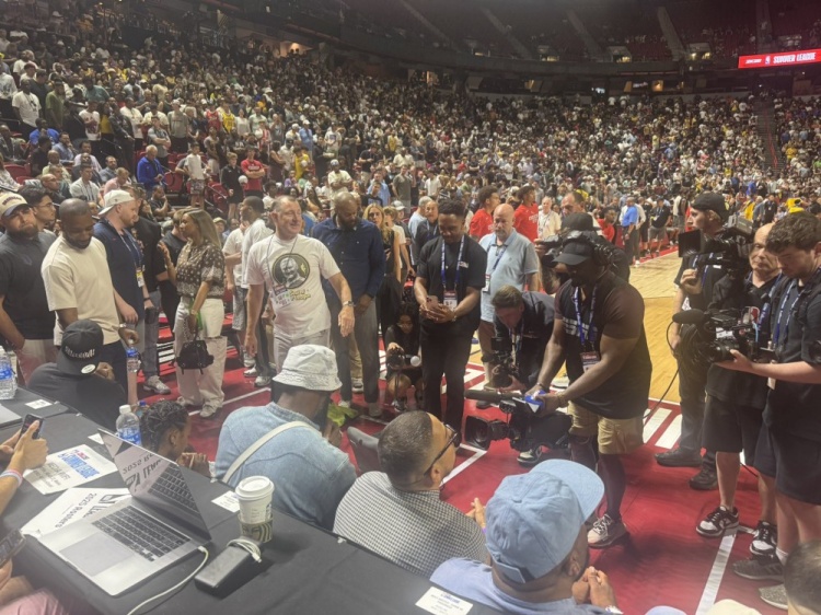 自带热度!老詹观战湖人夏联 刚入座便被摄像机包围?